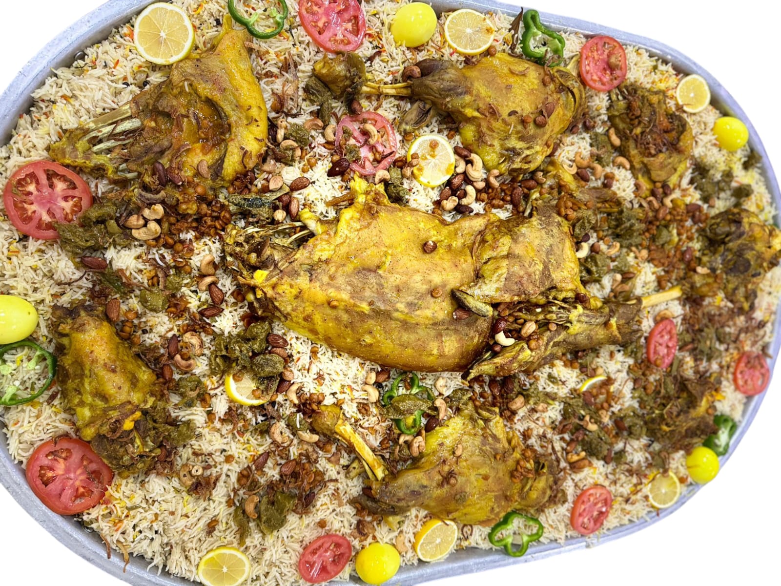 Enjoy a feast of a local goat weighing between 10 to 13 kg, enough for 8 to 9 people, carefully prepared to be the perfect choice for your special occasions. The goat is served with luxurious rice and you can choose between Biryani with its rich flavors or Majboos with its authentic traditional taste. The feast is served on a single tray decorated with the most delicious additions such as roasted nuts, fresh tomato slices, lemon and various vegetables, to complete the experience with a luxurious appearance and exceptional taste that suits every celebration and invitation.