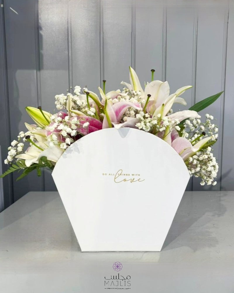 دع سحر الطبيعة يتحدث بلغة الأناقة مع ورد "أناقة الليلي"، المكونة من 6 ورود ليلي فاخرة، تتناغم بروعتها مع لمسات ناعمة من زهور الجِبْسو البيضاء، لتمنحك تنسيقًا أنيقًا يفيض بالرقي والرومانسية.